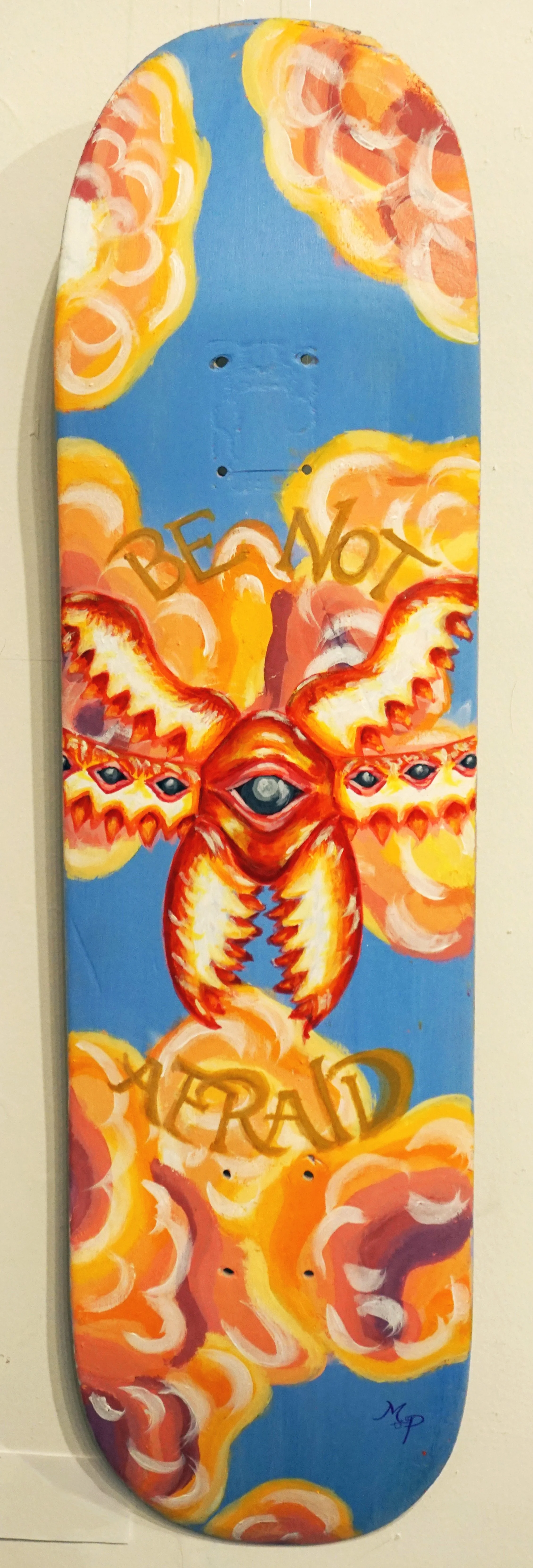 Livvy’s interpretation of a biblically accurate seraphim angel. This piece was entered in a skateboarding art contest at Fargo Skateboarding. To express her faith, Meraki the Phoenix chose to depict an angel with the words “Be not afraid” to express that God and his angels are always with us, and we should go forth in our vocations without fear.