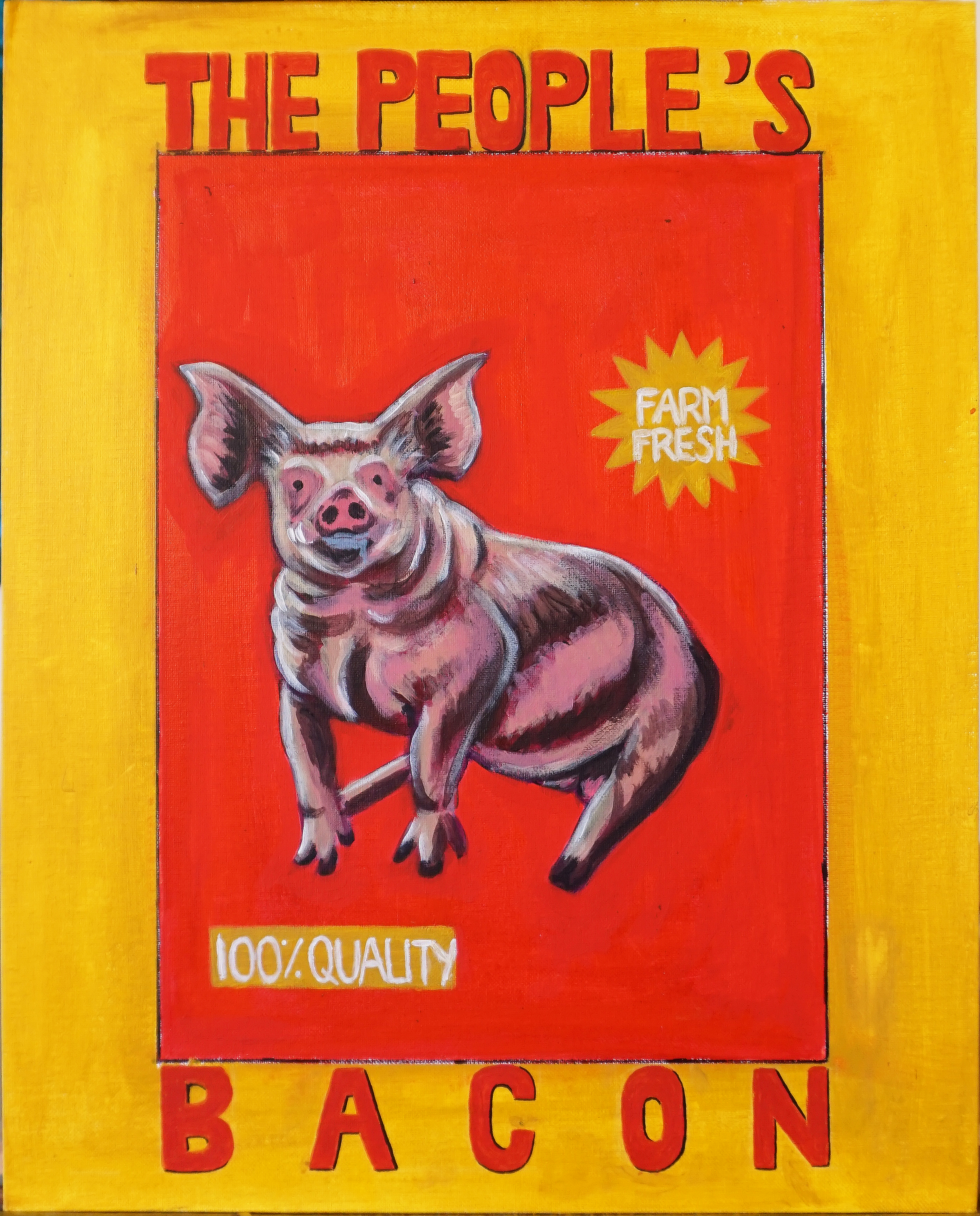 A satirical painting done in the style of a vintage poster, advertising “farm fresh” bacon. The irony is in the promotion of “100% quality” next to the image of a sick pig. This is representative of a lot of the misleading marketing of mass-produced meats. Most companies attempt to hide the realities of the product they are selling, leading consumers to believe they’re buying good meat when the majority of meat sold in grocery stores comes from poorly treated animals in factory farms.